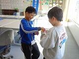 1年生に、感染症にかからないために手洗いがとても大切なことを伝え、一見、きれいに見える自分たちの手がいかに汚れているかよく分かるように、テスターを使って汚れ具合を調べました。子供たちは意外にも汚れている自分の手を見て、「これからは、もっときれいに洗えるように、しっかり手を洗います。」と、話しました。